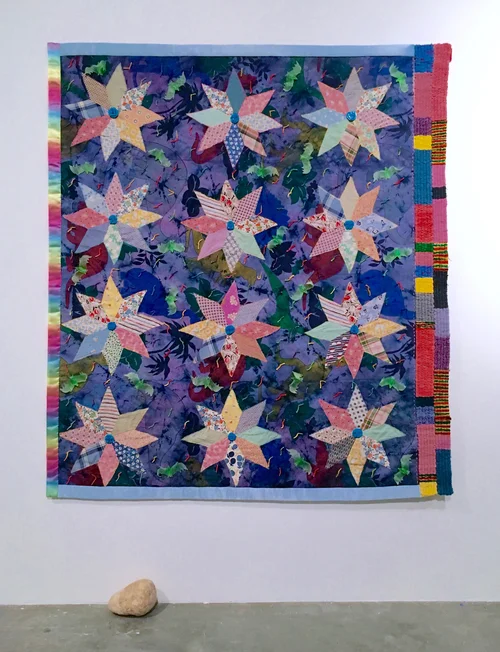 Bedsheet, oil paint, antique quilt pieces, merino wool, food dye, polyester binding, Egyptian paste, rubber bats, ballast stone; 2016