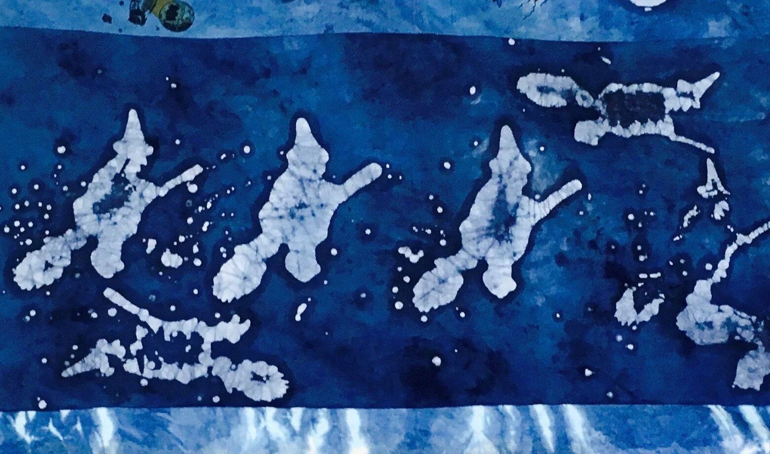 Towel, bedsheets, indigo, beeswax, merino wool, food dye, found patch, zipper, Egyptian paste, acrylic yarns; 2016